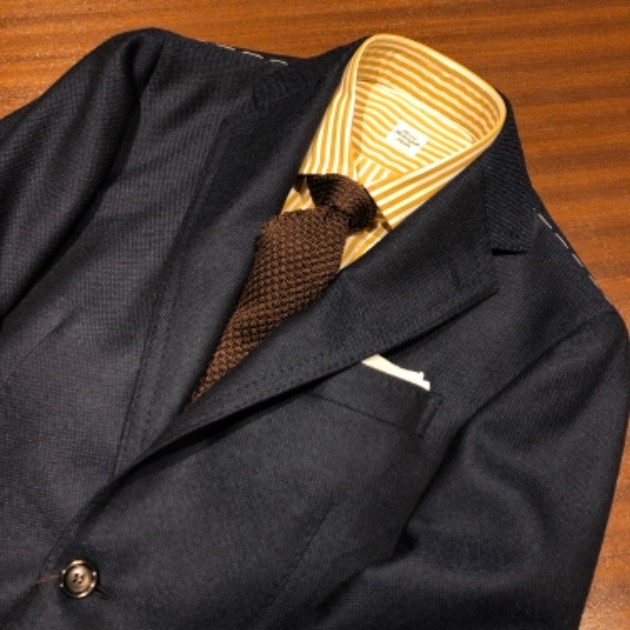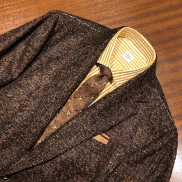 タッターソールのボタンダウンをイメージしておりましたので、今回のオーダーはそのままのイメージで。普段はそんなにボタンダウンを着ないのですが。タイドアップ、ニットベストのレイヤード。コーデュロイスーツのインナーに。何となくそのような合わせのイメージです。