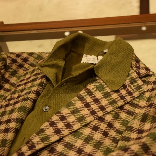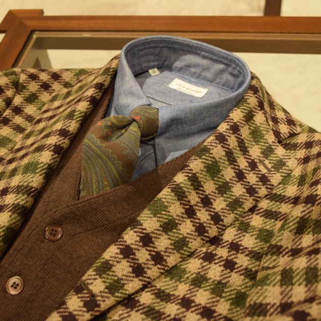 全体的にシックなトーンで纏めつつ、クレリックシャツを用いることで、あまり地味にならないようにしています。シャツは<BARBA>のサンドストライプ柄のお品で、ブルー×ブラウンの細かな柄使いが、非常にクラシカルで良い雰囲気です。今年の<BARBA>は秀逸な生地のバリエーションだと、スタッフの間でも話題なので、早めにチェックして頂くと良いと思います。