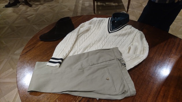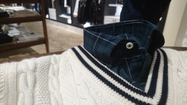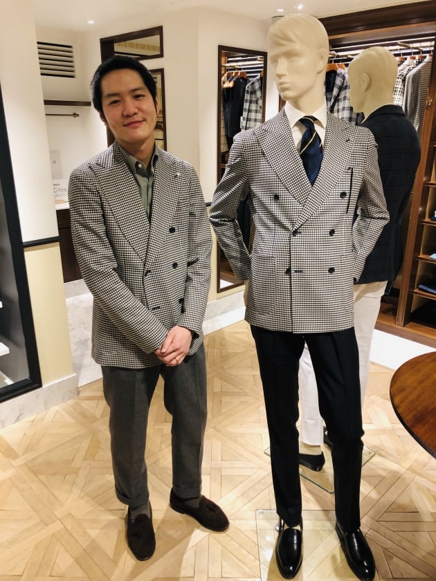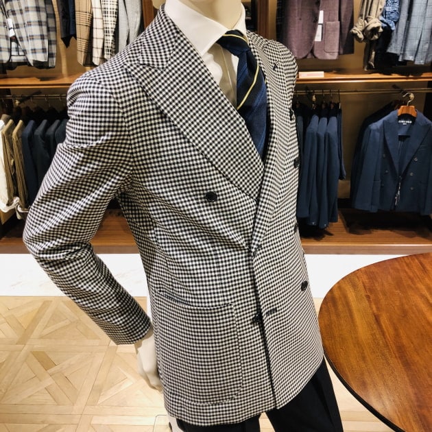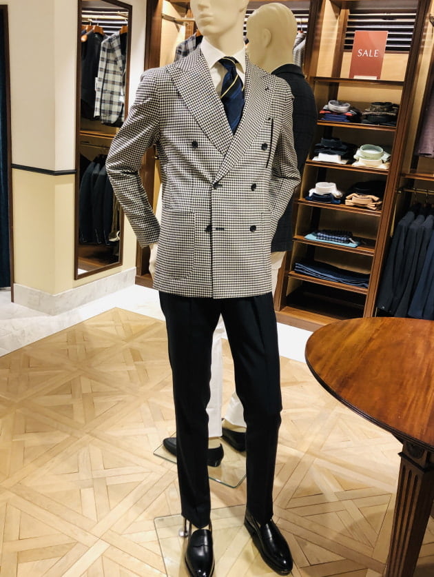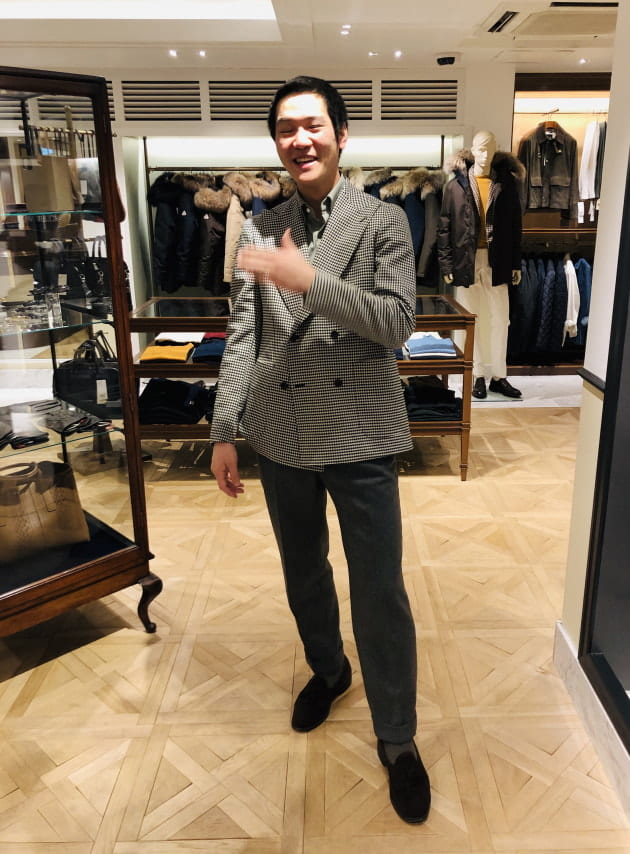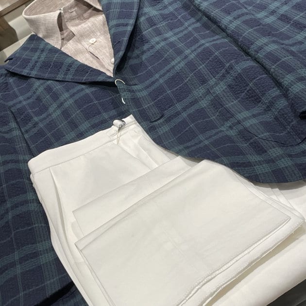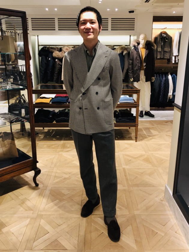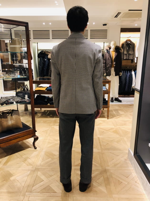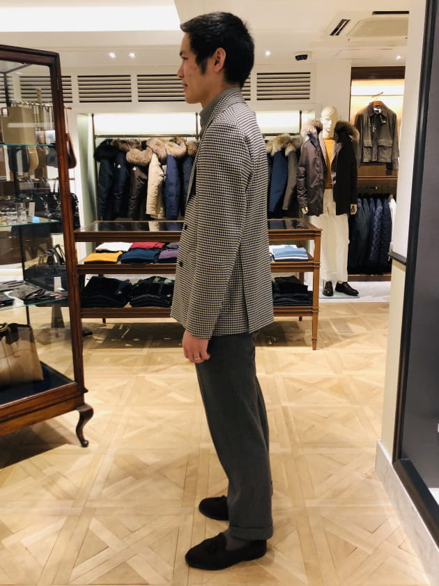 コードレーンのパンツに対して、チェックのタイ。控えめなカラーをチョイスし、柄で遊んだコーディネートです。