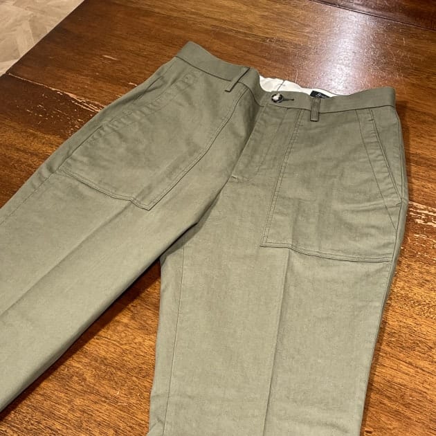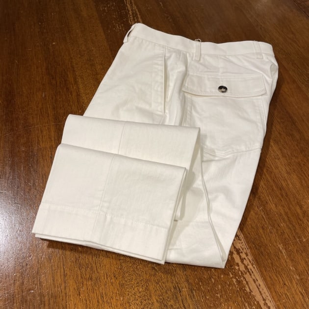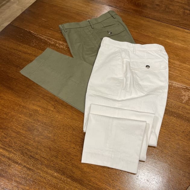 コットンヘリンボーン生地のベイカーパンツです。昨年もオリーブカラーで展開し人気商品となりましたが、今年は新色のホワイトを新たにラインナップ。2色展開です。何かと蘊蓄の多い品物ですので、その辺りのお話も含めて改めて。