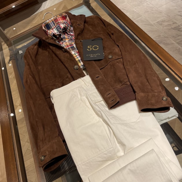 例えば秋口にはこのような合わせ方を。スエードのドライビングブルゾンにベイカーパンツ。オーセンティックなアイテム同士でミックススタイルなんて感じも良いですよね。ん、スエードドライビングブルゾン...?