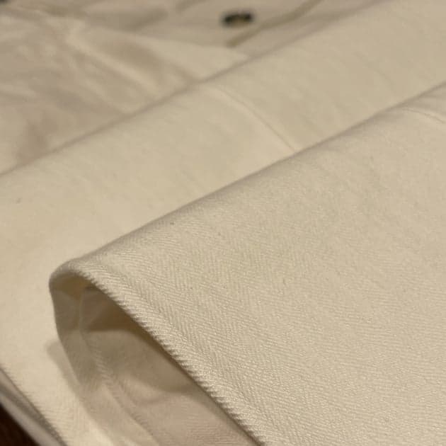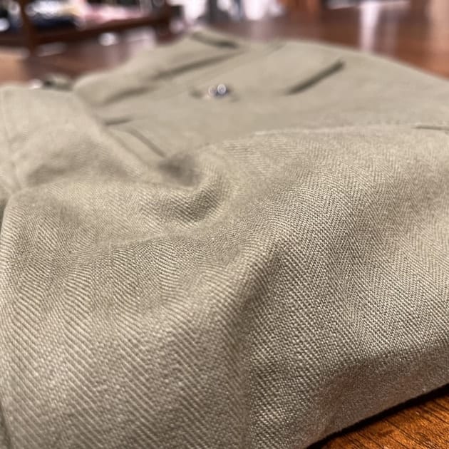 ヘリンボーン織りのコットン生地です。40年代からワークパンツに使われていた生地が再現されています。左右対称でなく、表裏を交互に出すヘリンボーン組織。糸の色ムラをあえて残すことで当時の生地感を忠実に再現しています。マニアックなディティールですが、これによって良い表情に仕上がってますね。通年でお使い頂けそうな生地感です。