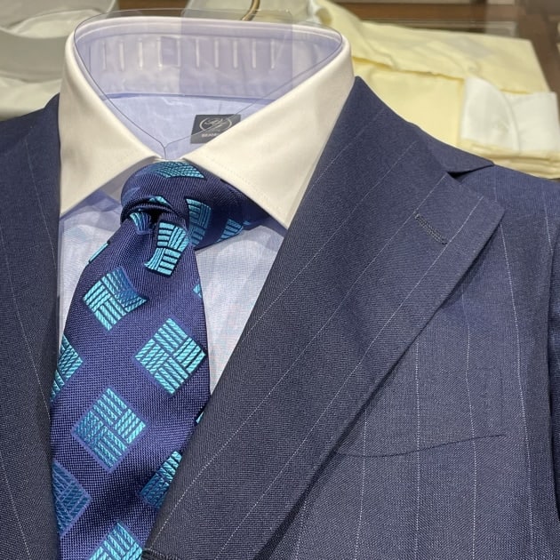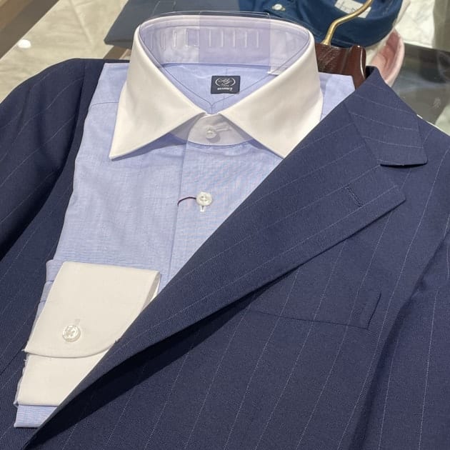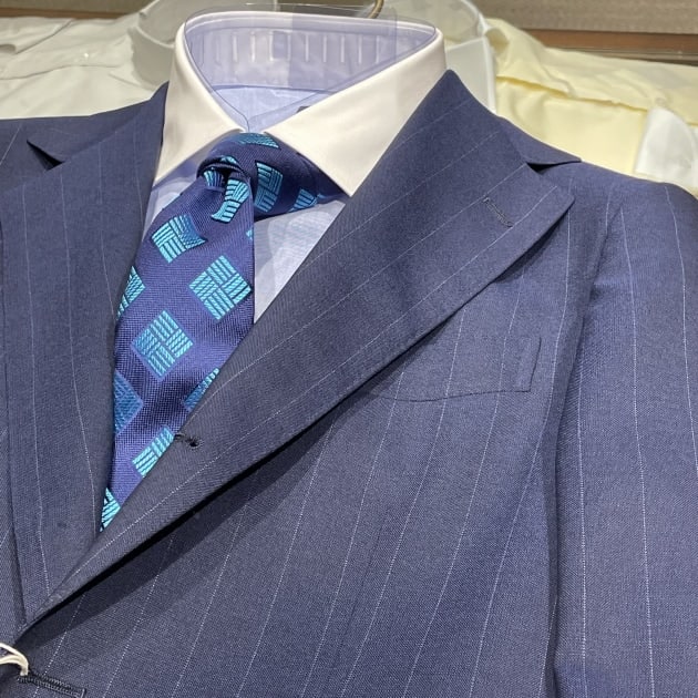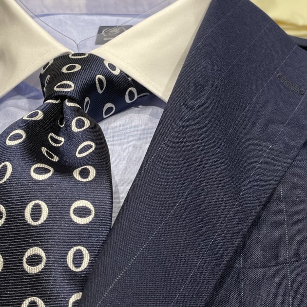 FOX BROTHERSの英国的な雰囲気に完全に引っ張られていますが、ブルーのクレリックシャツにドットのネクタイ。ブリティッシュなイメージで纏めてみました。