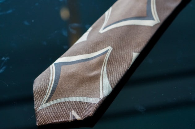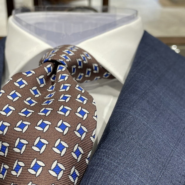 ネクタイは柄が強めのプリント物。スーツやシャツがシンプルだからこそ、合わせたくなるネクタイですね。ネクタイから考えて、シャツやスーツで生地にこだわりつつ、柄は引算。そんなコーディネートです。余計な色を加えずに、ブラウンからベージュの色味で纏めることで、柄の割にはスマートな印象を演出しているのもポイントですね。