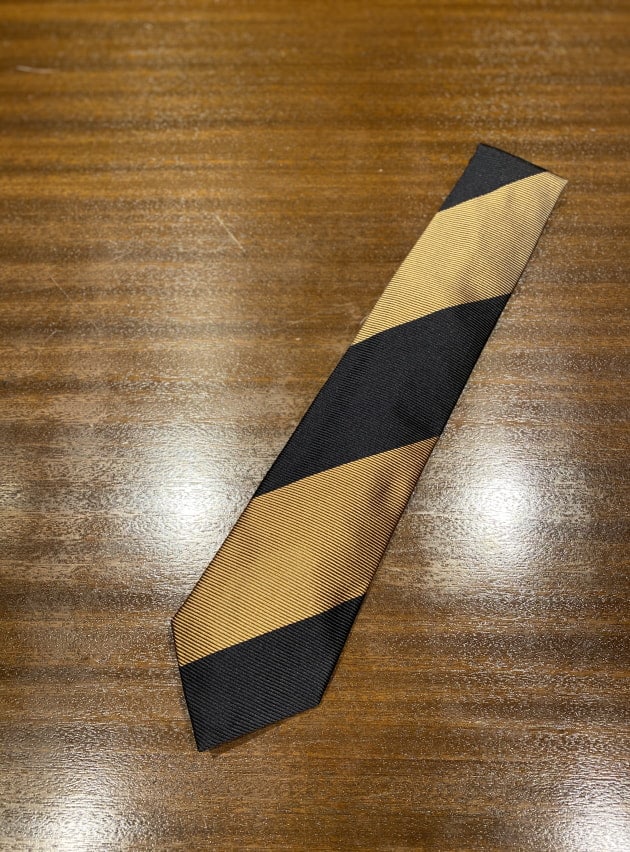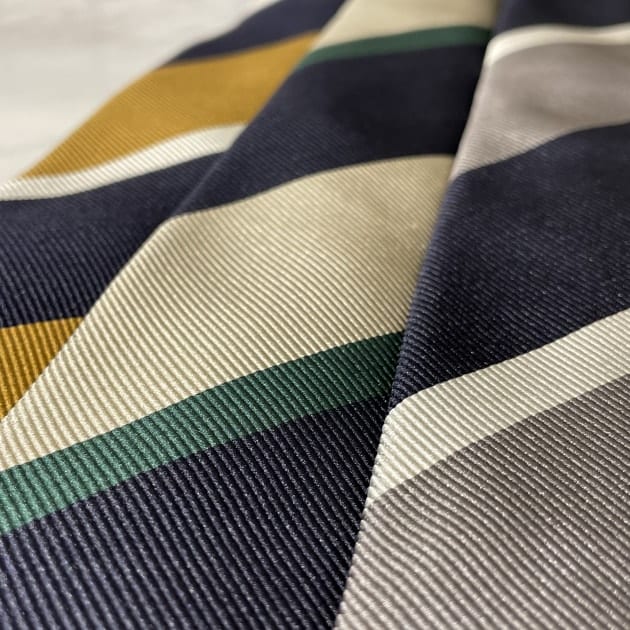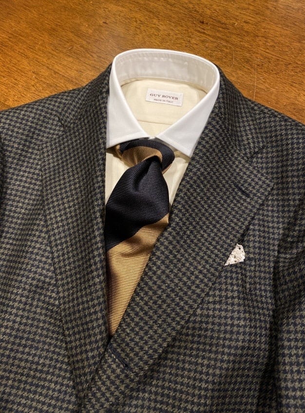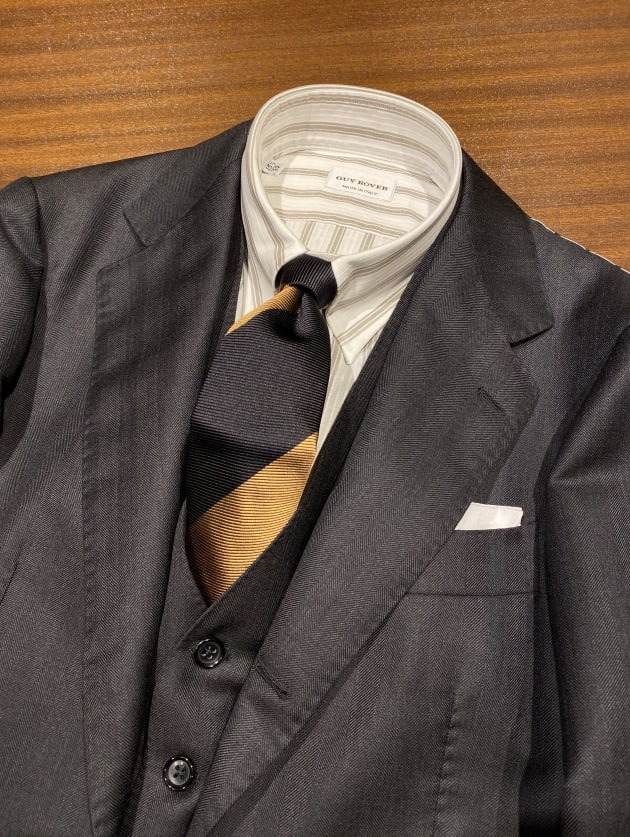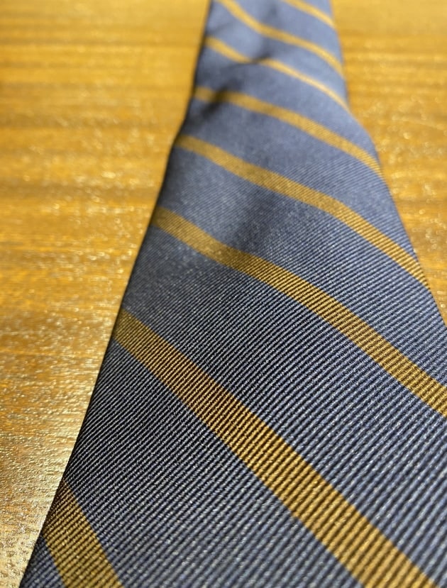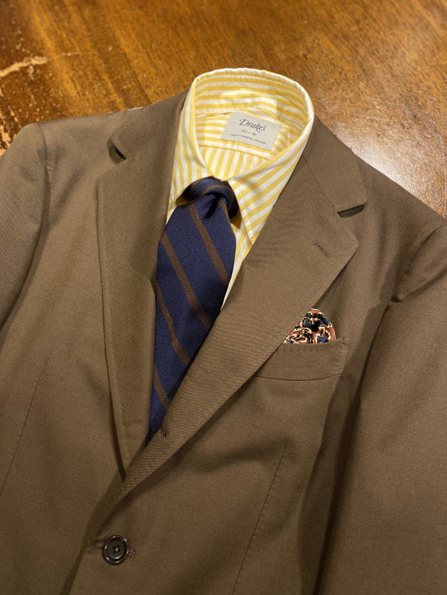 こうした、雰囲気のあるレジメンタルタイが増えたので、ストライプ柄のシャツとも合わせやすくなった印象があります。引算ではなく、足算のコーディネートですね。メリハリが効いていれば、煩雑ではなく、クラシカルな雰囲気を演出できるので、ぜひトライして頂きたいコーディネートです。