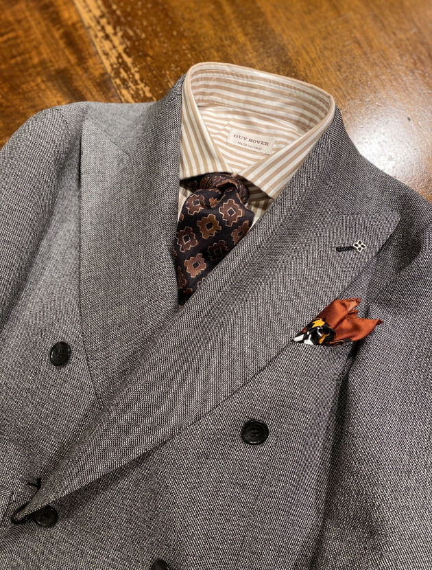 艶っぽくなり勝ちなスーツ生地ですが、シャツやネクタイのドライな風合いが、上手くバランスを取ってくれています。