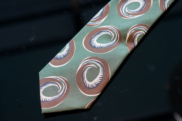 ネクタイはクラシックな雰囲気を演出してくれる、大柄のペイズリープリント。シャツとネクタイで、柄のテイストやバランスを変えて、メリハリを付けています。個人的には1番好きな雰囲気のネクタイ。どうしても使いたかった一本ですね。