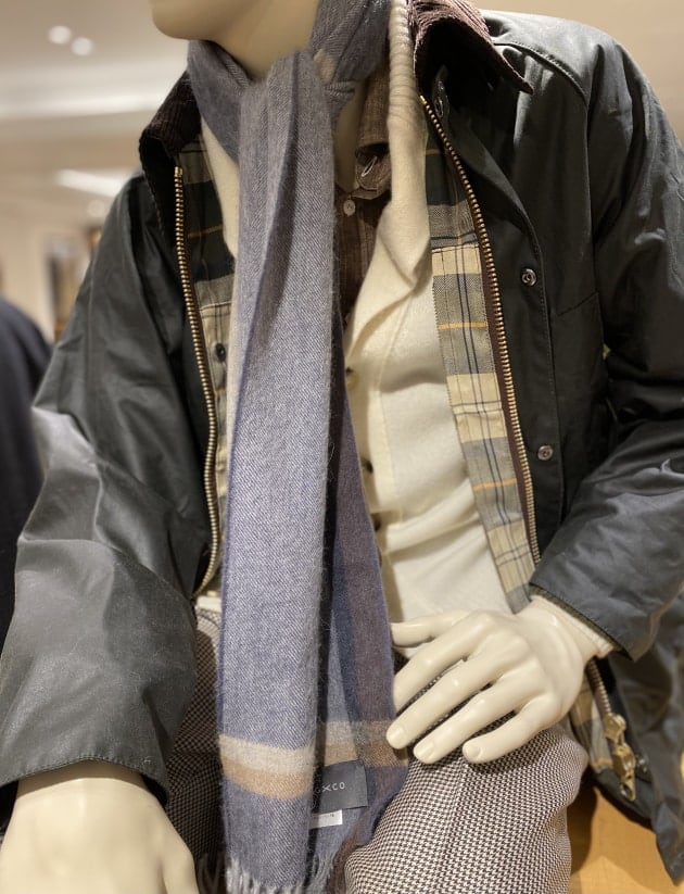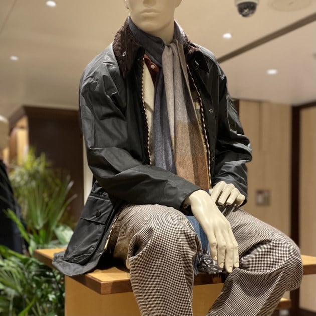 トップスは<BARBOUR>TRANSPORTジャケットです。ダークトーンのコーディネートに、ボルドーのストールでアクセントを付けました。