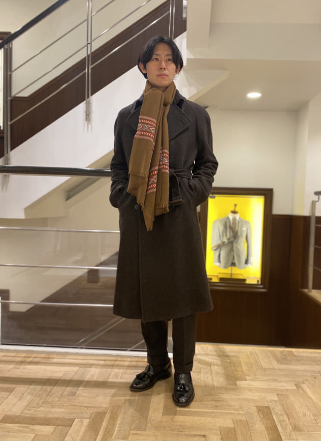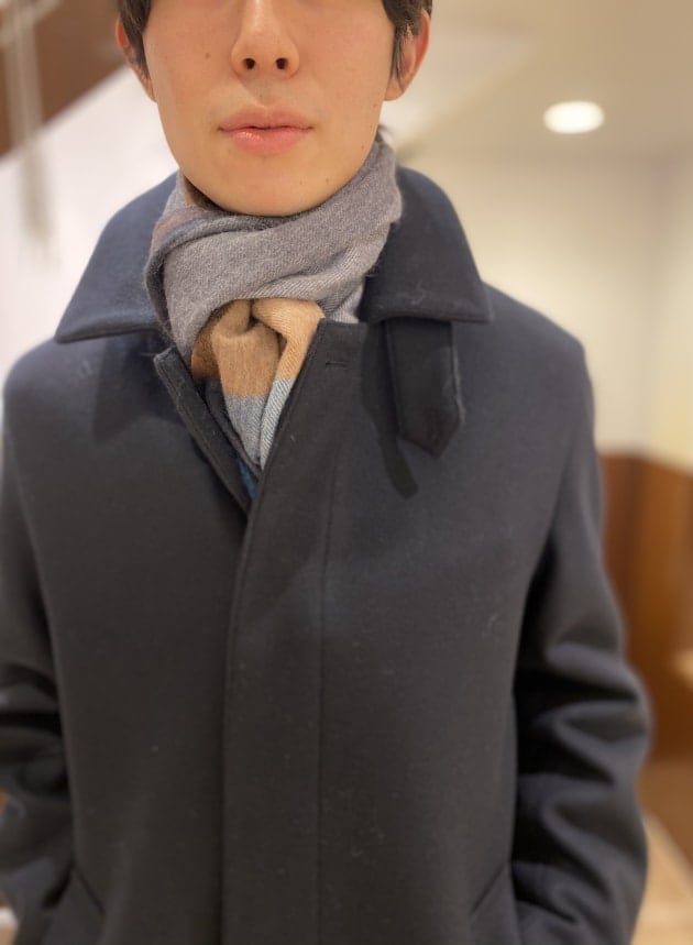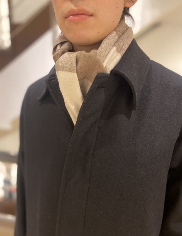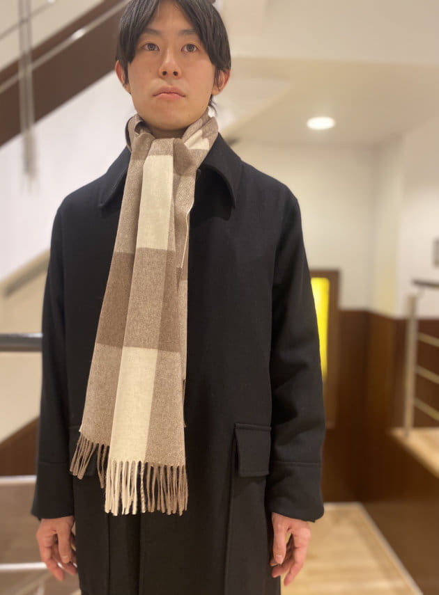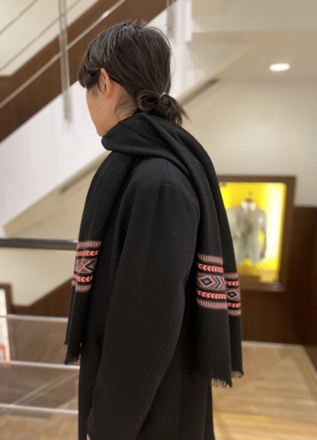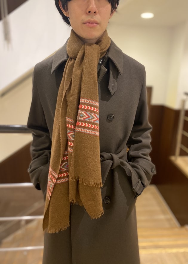 そのパターンばかりでもつまらないので、今回はあえて無地のストールを採用してみました。ストールが主役のコーディネートと言ってもいいかもしれません。品物も非常に良いですしね。少しでもお客様の目に触れる機会が増えれば。そんな意図もあったりします。