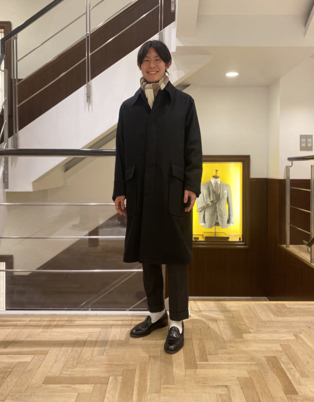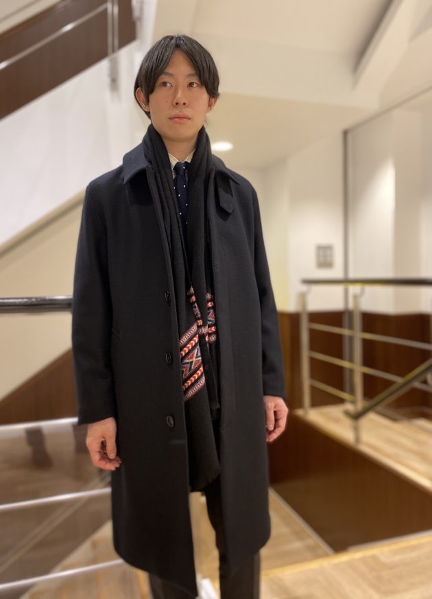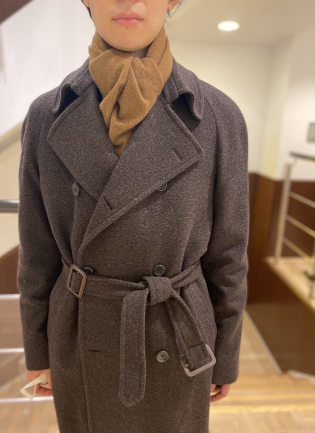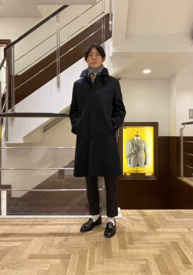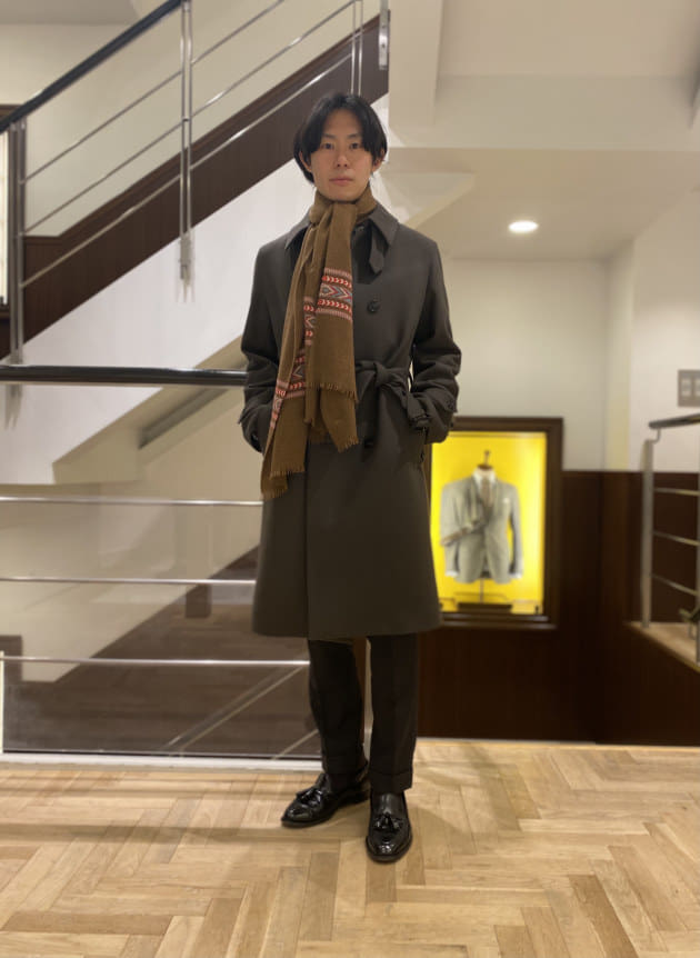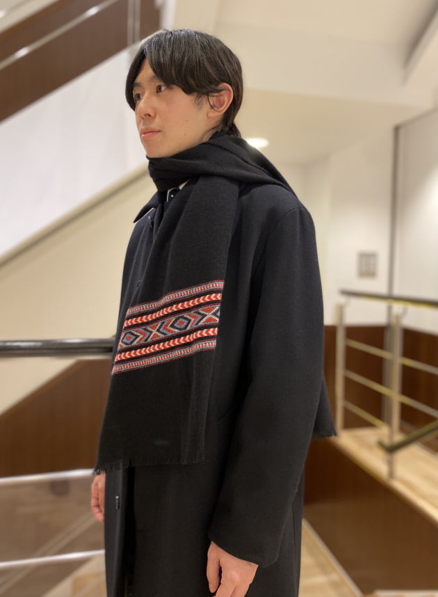 そのパターンばかりでもつまらないので、今回はあえて無地のストールを採用してみました。ストールが主役のコーディネートと言ってもいいかもしれません。品物も非常に良いですしね。少しでもお客様の目に触れる機会が増えれば。そんな意図もあったりします。