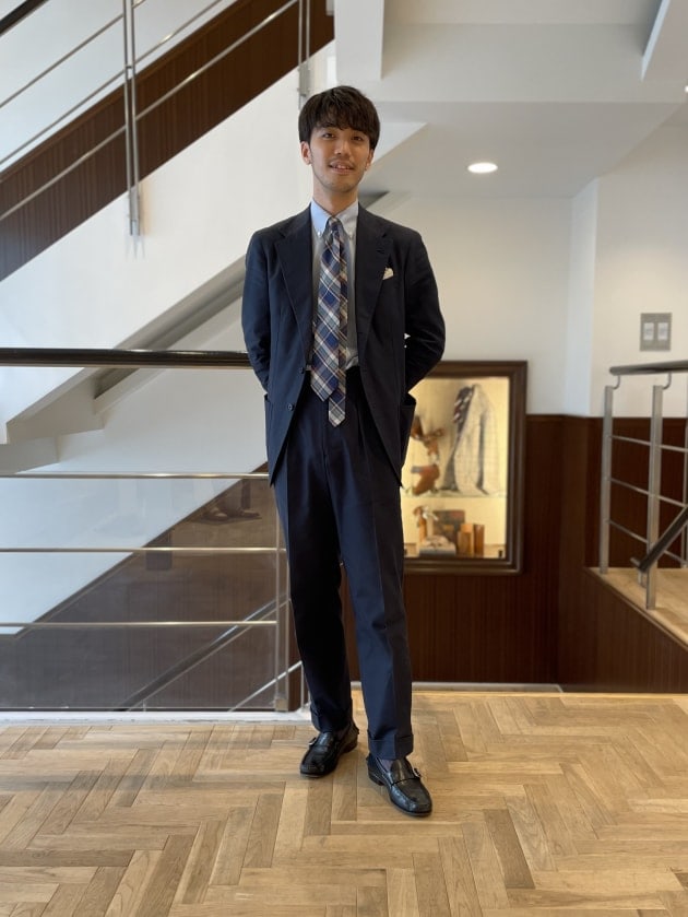 今はメンズドレス店舗のディスプレイ、レイアウトの統括を務めています。この日は店舗巡回で当店に訪れました。せっかくなので、この日のスーツスタイルを撮影させてもらいましたよ。ネイビーのコットンスーツですね。上下共にオーダー品です。