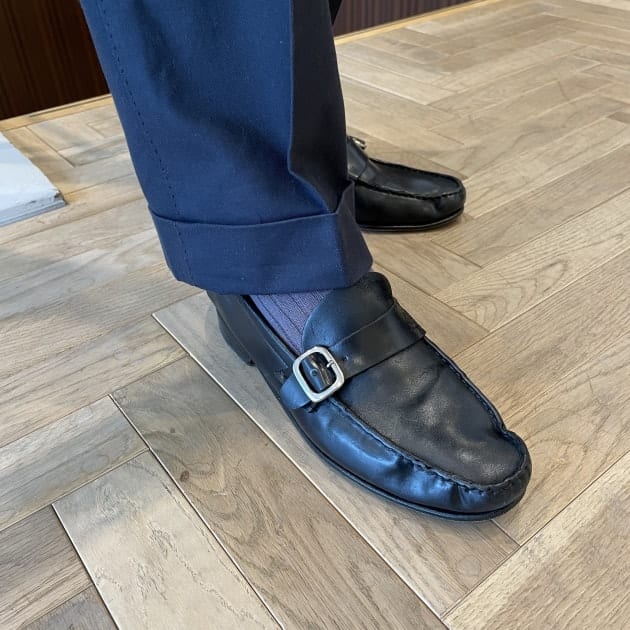 足元はシングルストラップのコードヴァンモカシンです。軽快な雰囲気ですが、少しモダンな佇まい。サイズによっては、若干数在庫も残っているようです。