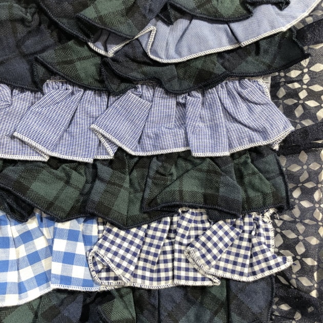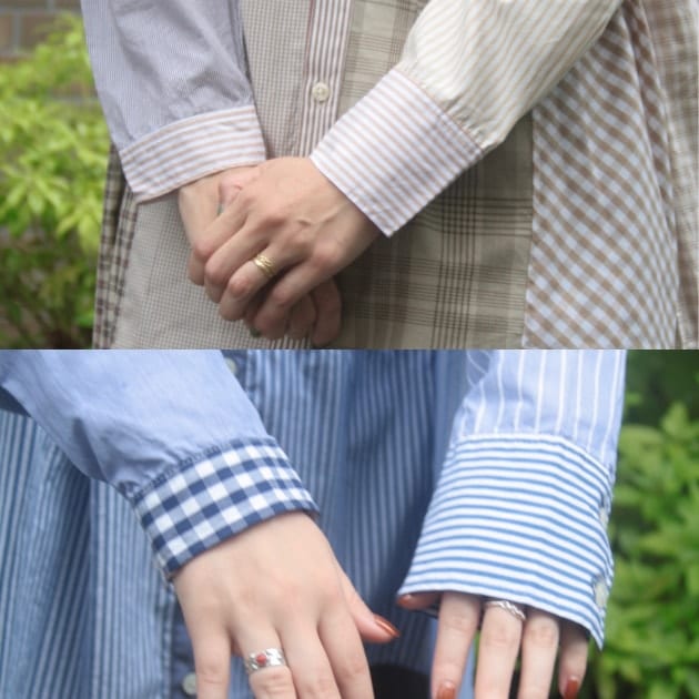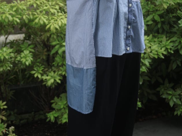写真では、パッチワークを後ろにして着用していますが、こちら前後どちらも着れる2way仕様。