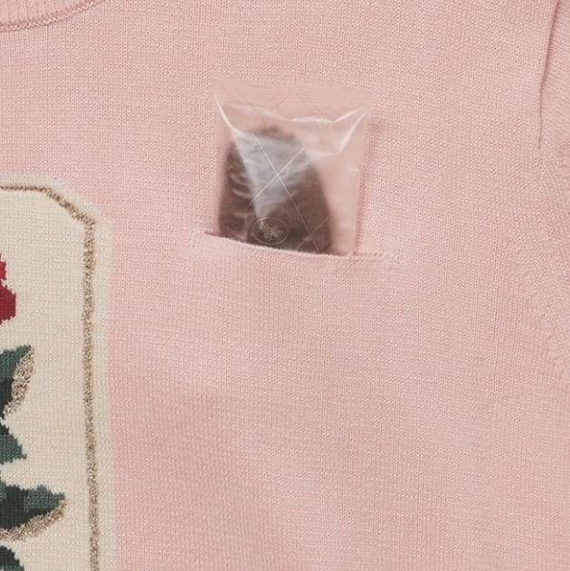 こちらは正方形タイプの箱をそのままデザインに落とし込んだバッグで、お菓子がぴったり入るサイズ感です。