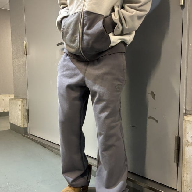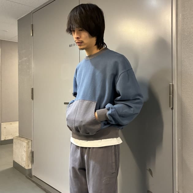 トップスの切り替えのグレーがパンツと同色のため、セットアップでご着用いただければより雰囲気が出ますね。