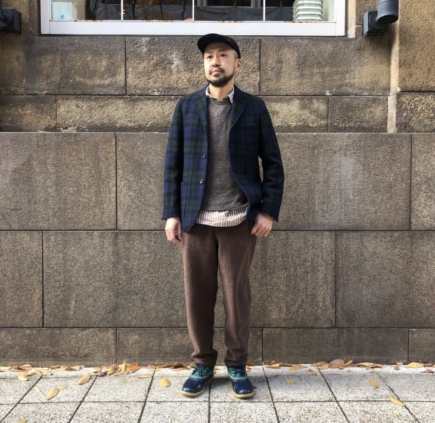 ハリスツイードのブラックウォッチ柄のジャケットで、シューズの色を拾いブラウンのアイテムをふんだんに取り入れて季節感を出す。