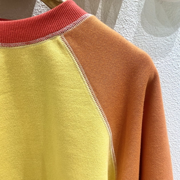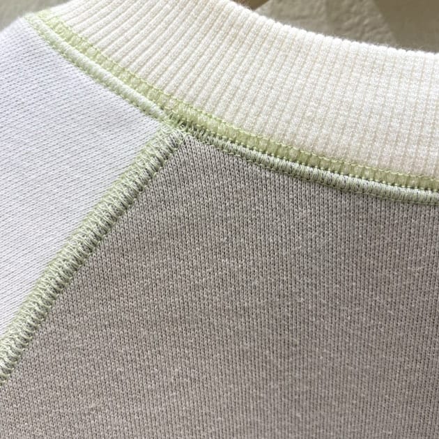 フライスにパイピングをかませる事で強度を保ちながら、着込むほどにネックラインが緩み自然な前下がりが生じます。