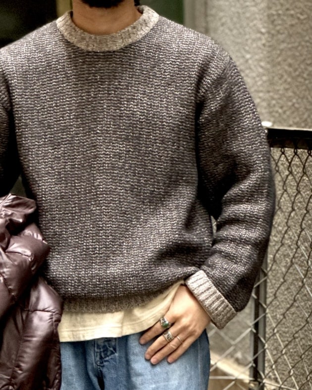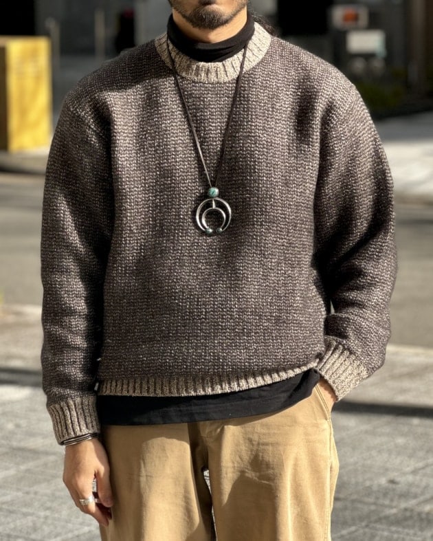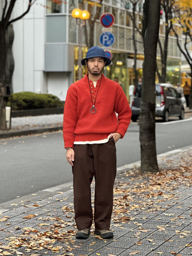 お気に入りのニット&スウェットパンツ、マウンテンブーツと合わせて、アウトドアムード漂う着こなしに。