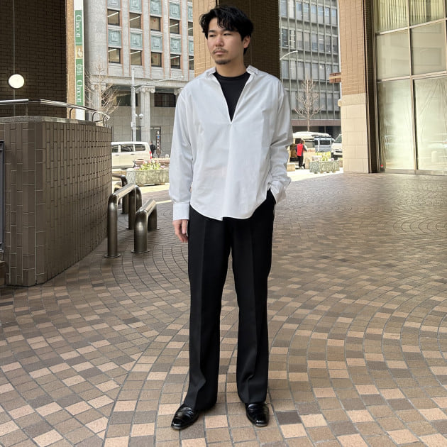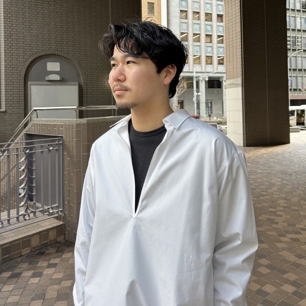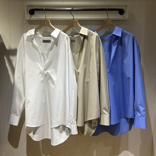 「胸元が開いてるシャツいいですよね」と話していたところに、つい最近入荷してきたこちらのアイテム。