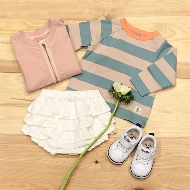 このカーディガンを使った、春に着たいベビーちゃんコーディネートです。