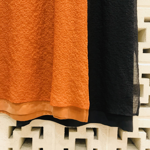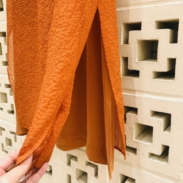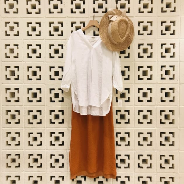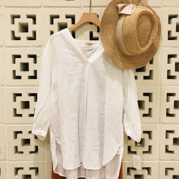 素材は、ポリエステル76%にコットン17%、麻も7%入っているので、ややシワ感のある表情です。軽やかで、ドライタッチな肌触りは、真夏のレイヤードスタイルを叶えてくれそうです。