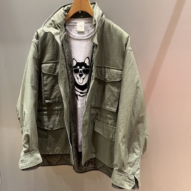 ミリタリーな無骨なアイテムに柔らかいニットの雰囲気とワンちゃんのイラストでハズす。