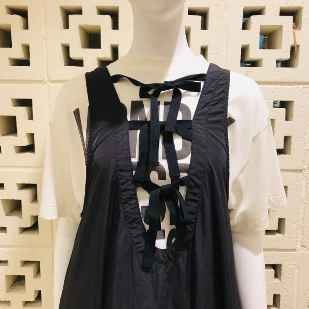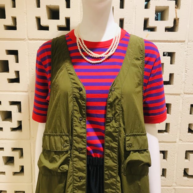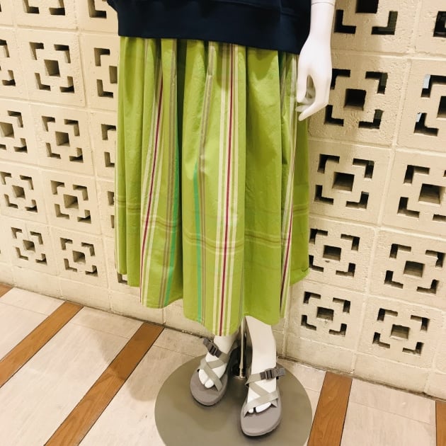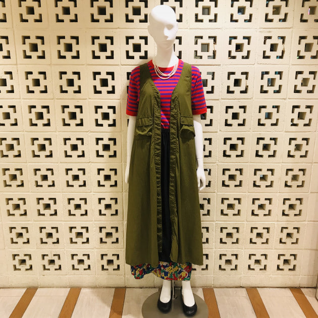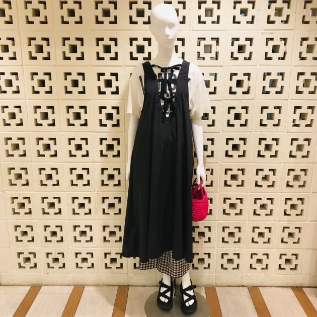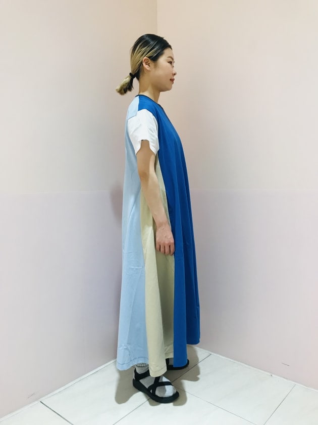 着丈はしっかり長めのお作り。透け感もなく、1枚でスタイリングがキマります。シーズンムード高まるサンダルや、軽快なボディバッグを合わせたスタイルにしてみました。