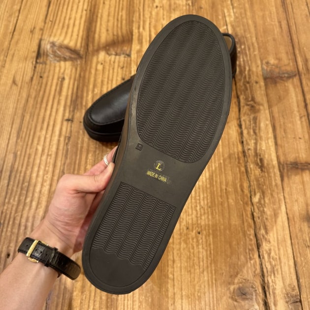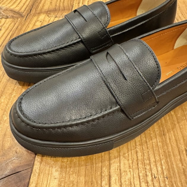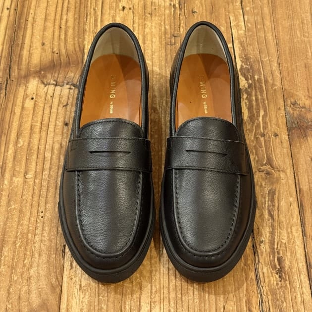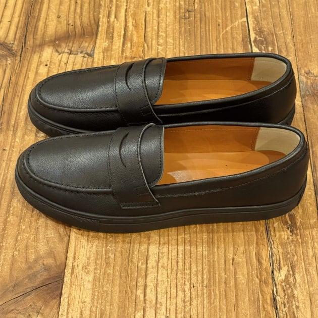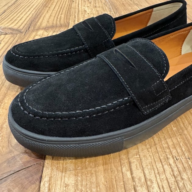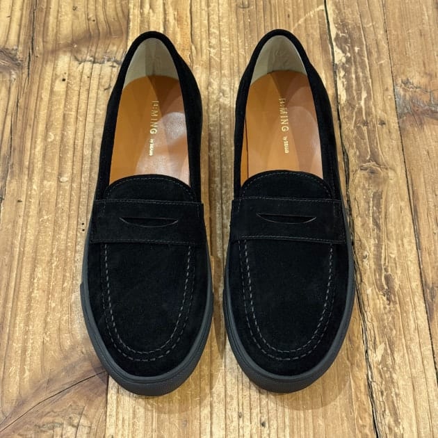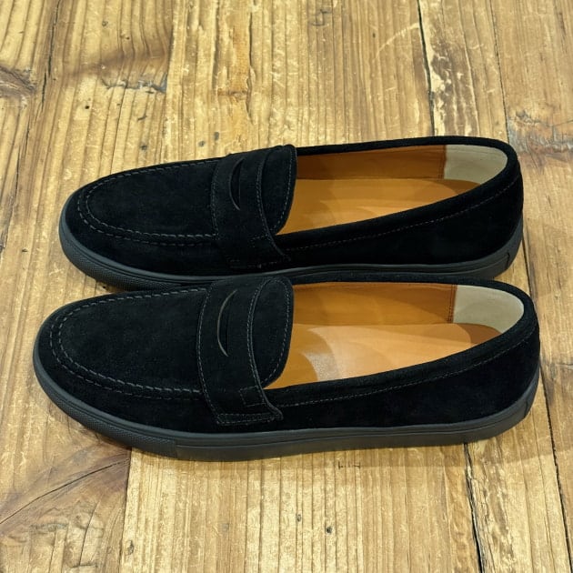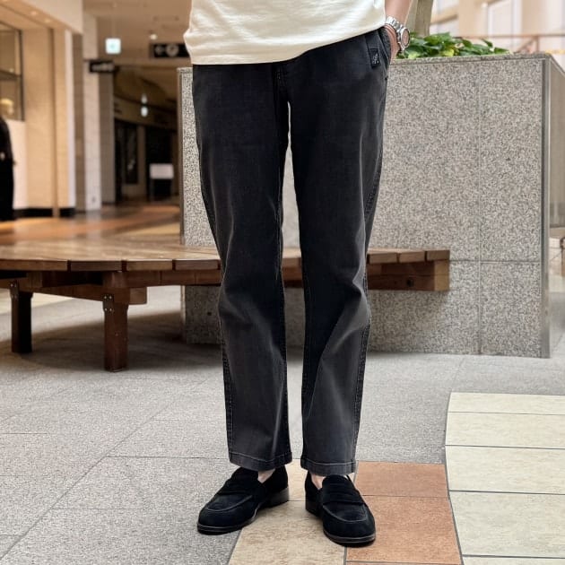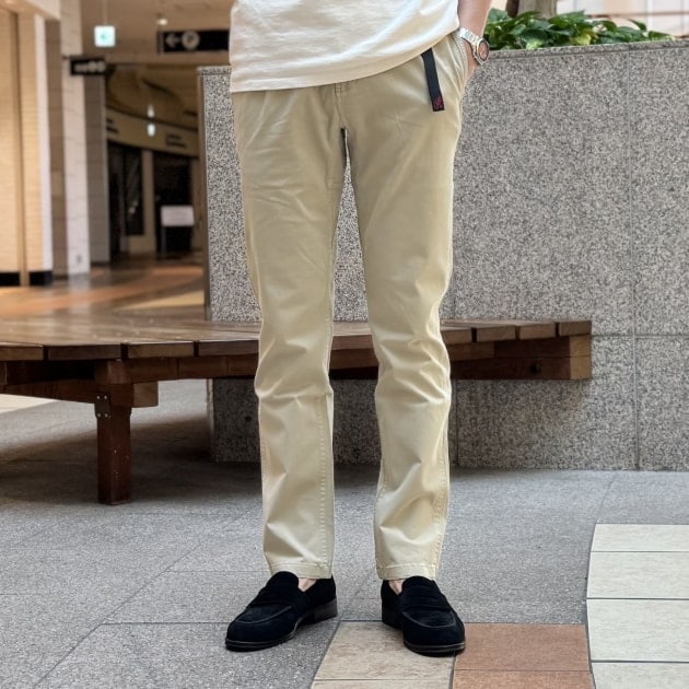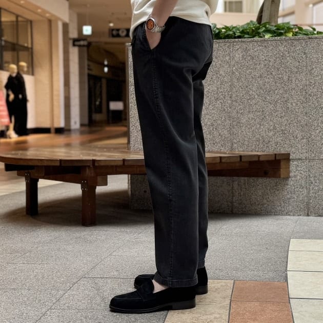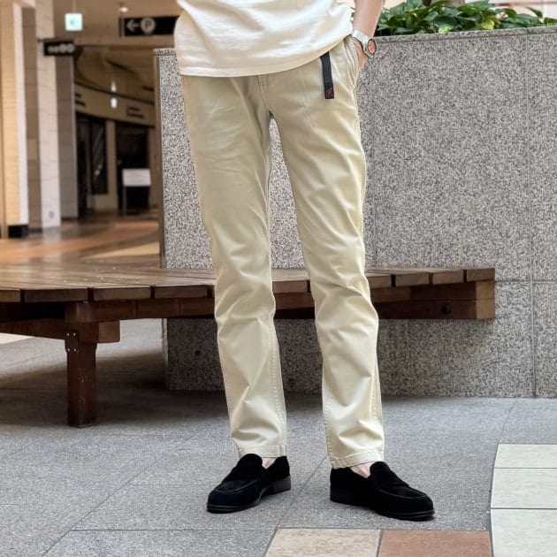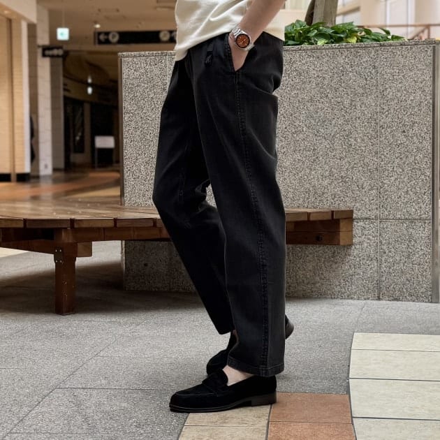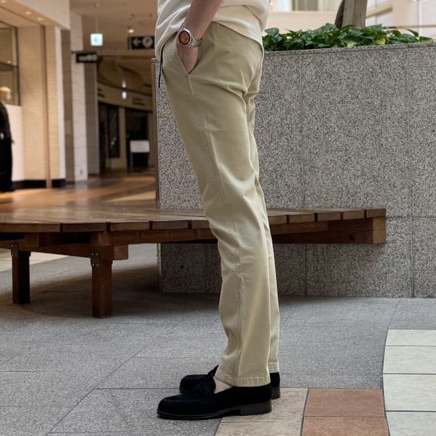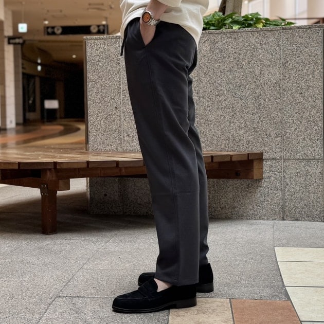 トップがカジュアルな合わせのため、ボトムスは細身のシルエットのパンツにスエードローファーで大人っぽく仕上げています。