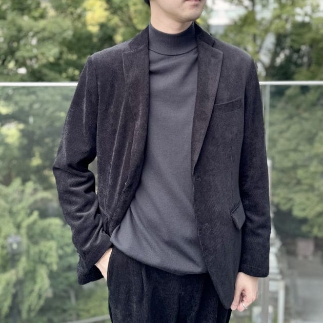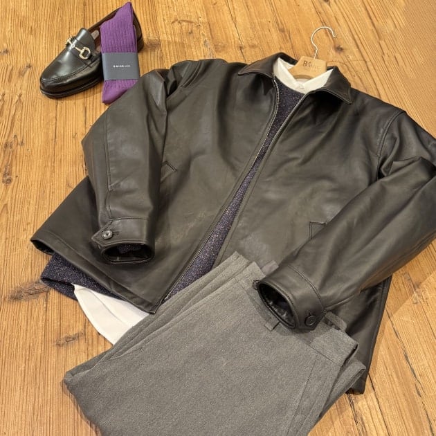 コート等の着用もおすすめですが、個人的にはレザー系のアウターが無骨さもあり、大人の男性にはおすすめです。