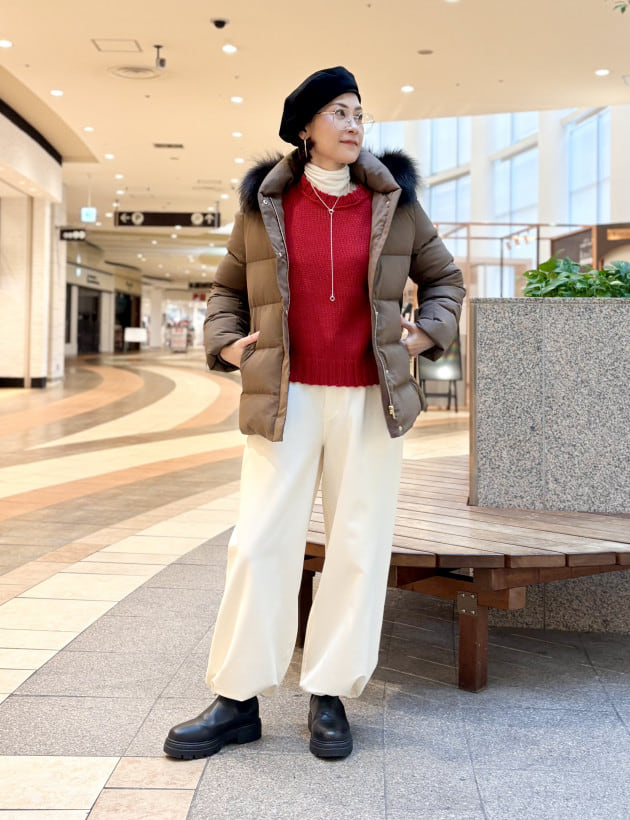 先程のセンタープレスパンツの色違いのベージュとボリューム袖のジャガードブラウスを合わせて大人可愛いセレモニースタイル。