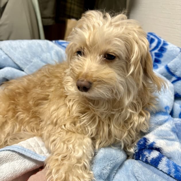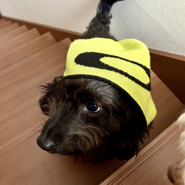 愛犬のラルにお気に入りのビーニーを被せてみました笑