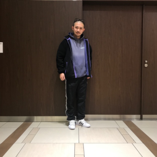 色を黒にし、統一感のあるスタイリング。少しいなたさもありつつ、SUPERSTARの3本線などがより主張される組み方です。