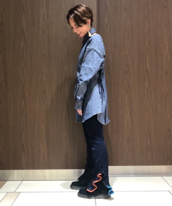 形が特徴的なシャンブレーシャツと裾にボリュームがあるパンツがポイントです!