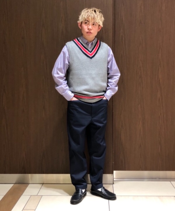 ストライプシャツにチルデンベストを合わせて爽やかなイメージにしました!