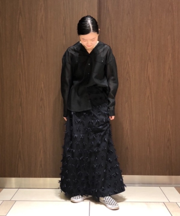 全身ブラックでシャツはオープンカラー、スカートはリボンの付いた物で軽さを出したスタイリング!