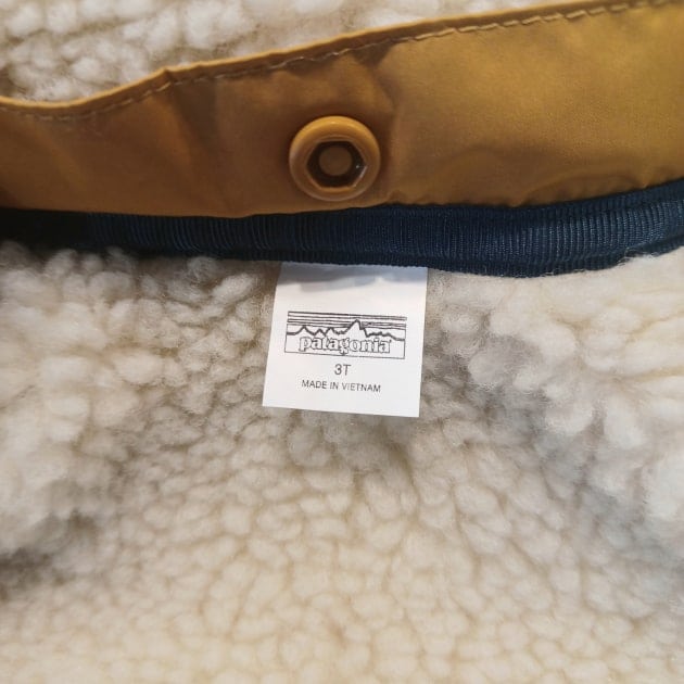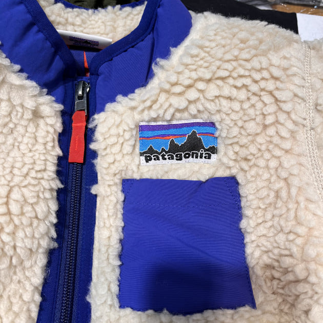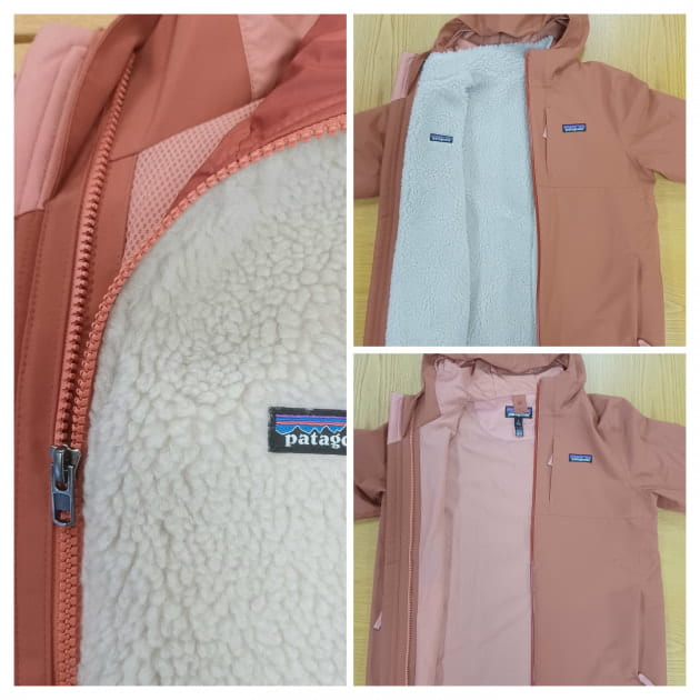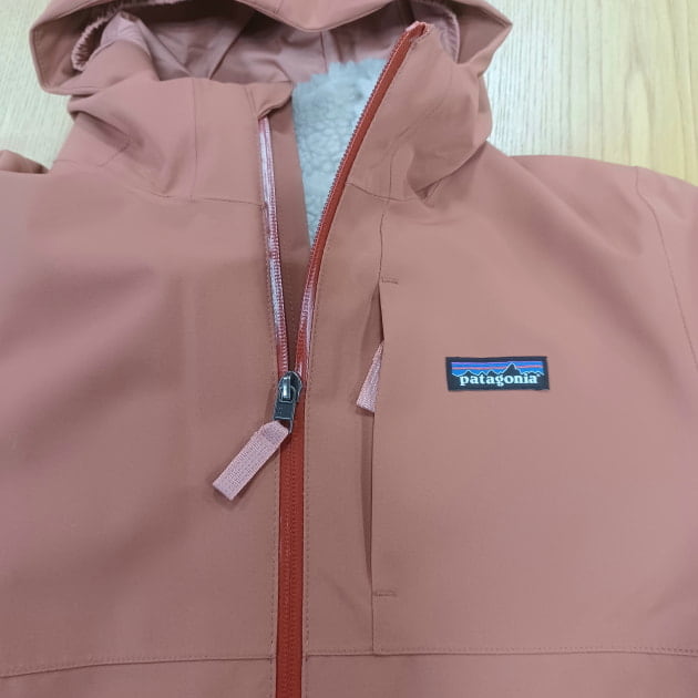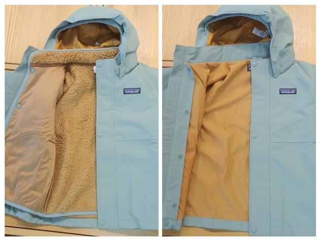 ↑の画像右上段は防水性・透湿性シェル+インナージャケット、右下段は防水性・透湿性シェル単独です。インナージャケットを外すとシェルの内側はメッシュ生地になっています。インナージャケットはリバーシブル仕様のため、右上段画像の内側にもpatagoniaのロゴが見えますね。