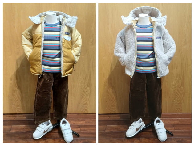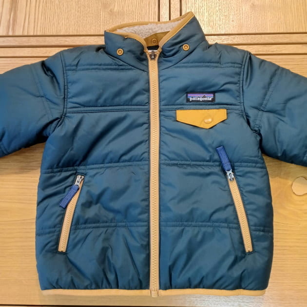その名の通り“リバーシブル(2WAY=二刀流)”でお召しいただけるベビー・トドラー向けのジャケット。“はっ水加工付き”のシェル面を裏返すと…