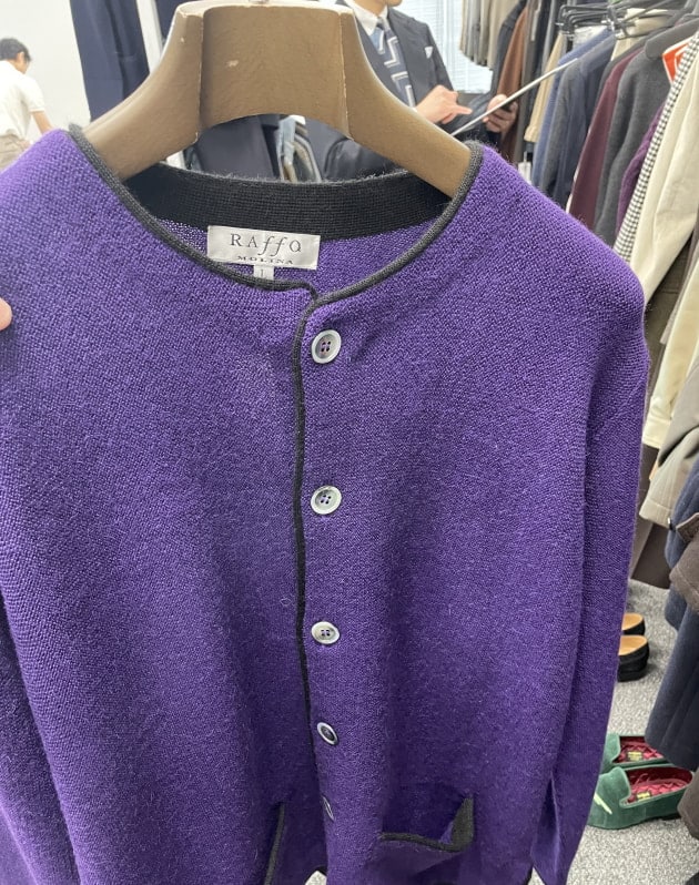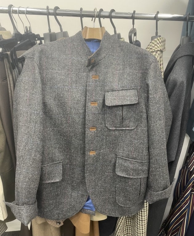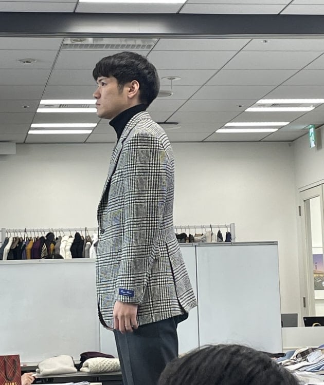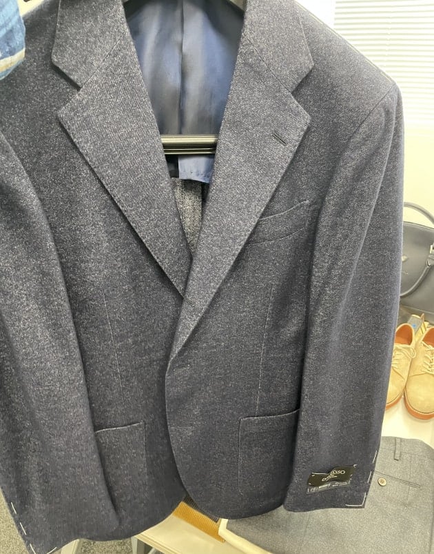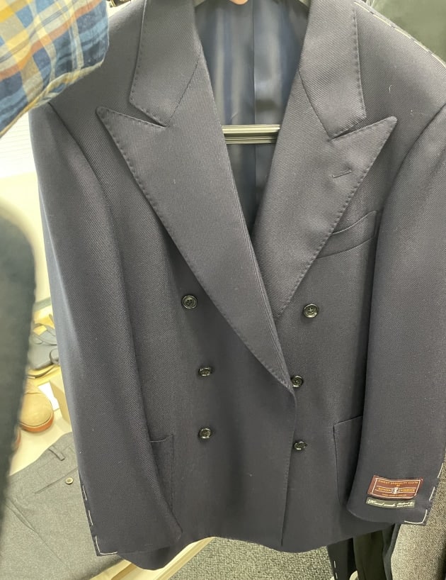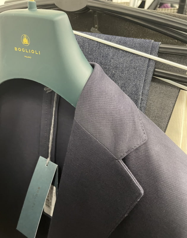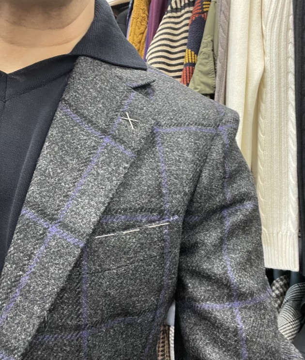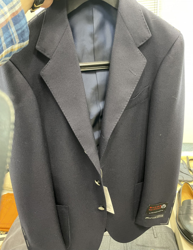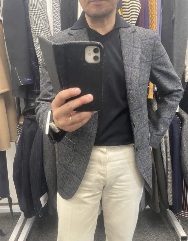 お客様にサンプルの試着をして頂きました。こちらはデ ペトリロのジャケット。配色がお好みのご様子。ブルーのペーンが上品。