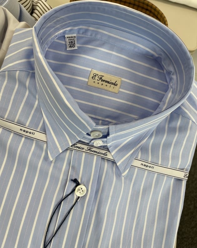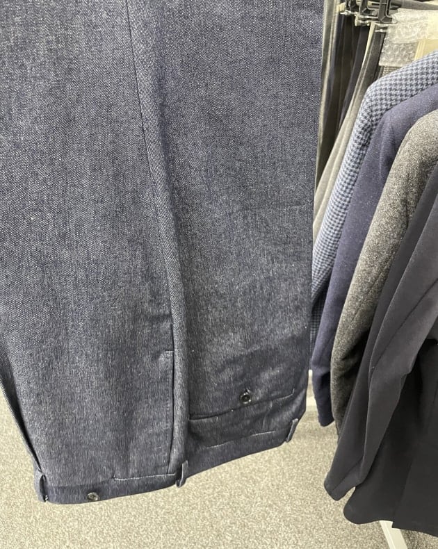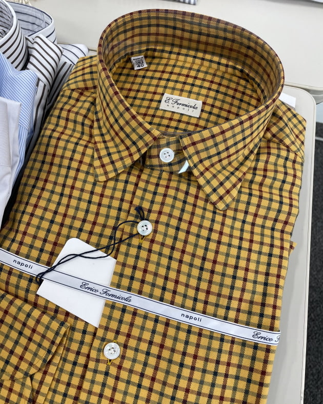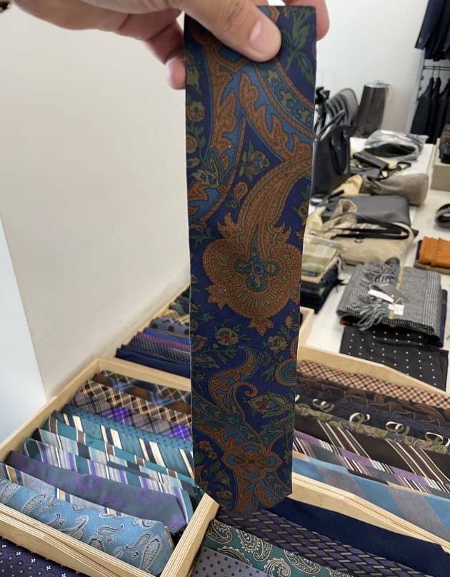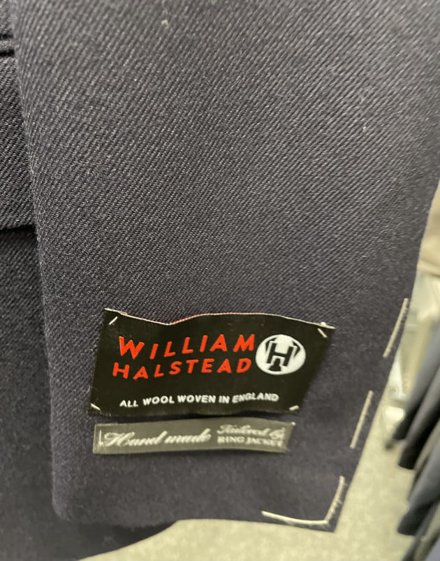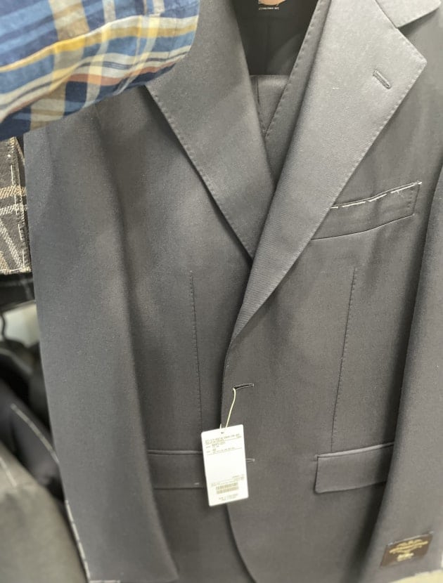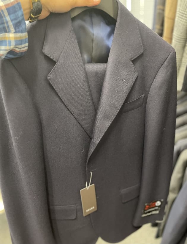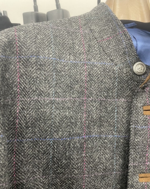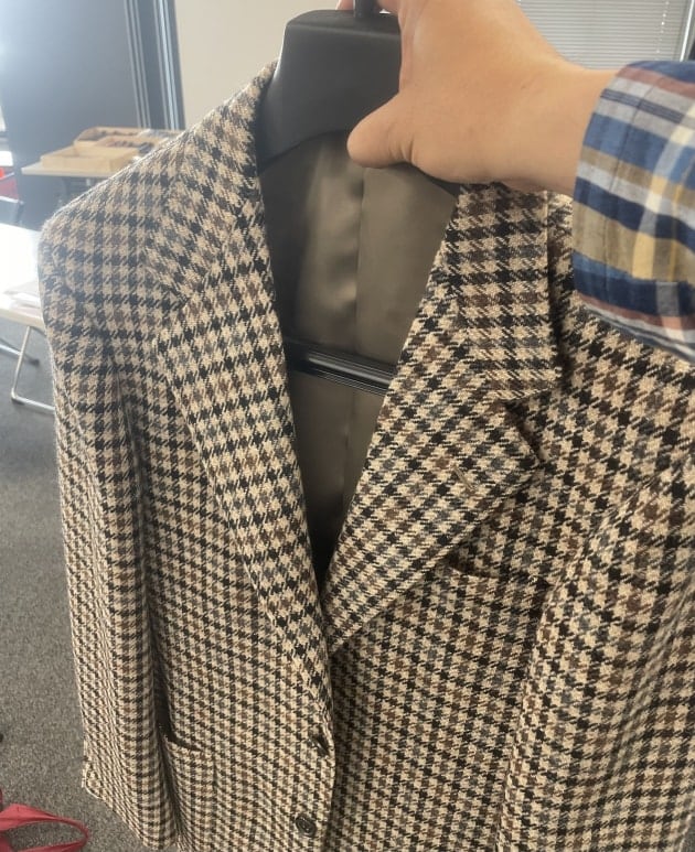 お客様にサンプルの試着をして頂きました。こちらはデ ペトリロのジャケット。配色がお好みのご様子。ブルーのペーンが上品。