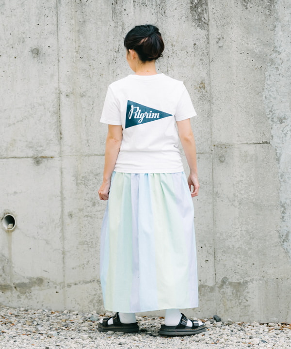 スカートは全体的にブルー系のグラデーションなので、白とネイビーとの相性がとても良い。