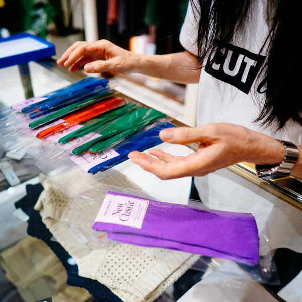 サステナビリティへの意識が高く、テキスタイルは常にデッドストックの生地を使用しています。ニット製品はすべて手作業です。