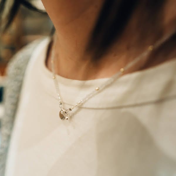 ざっくりニットやTシャツ、ワンピースなど首元のさりげないアクセントにおすすめな《les bon bon》のネックレス。