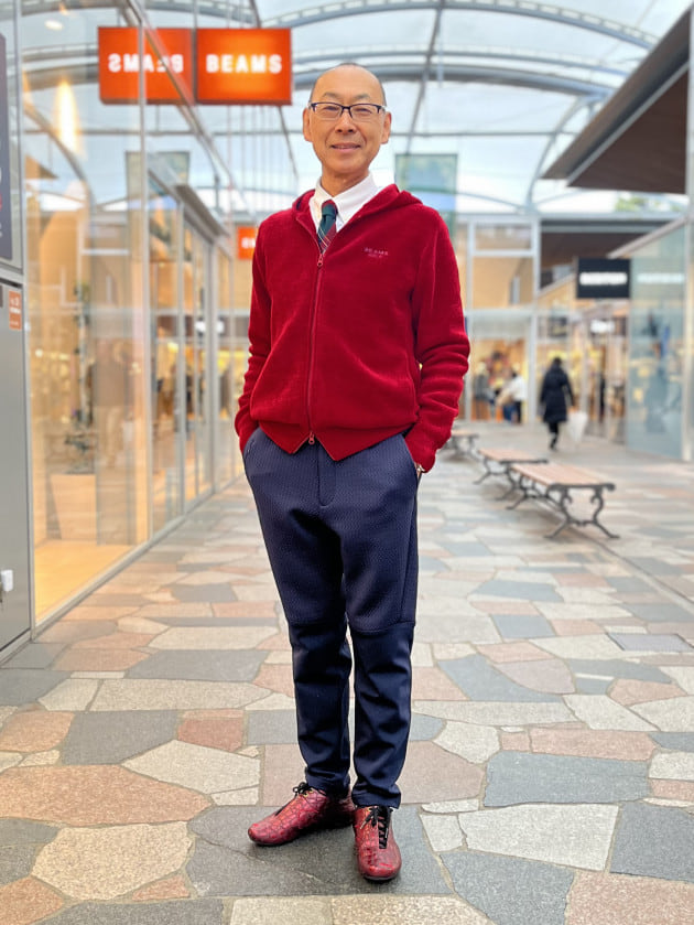 レッド×ネイビーで合わせたコーディネート。
