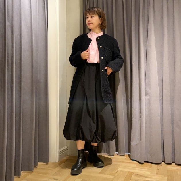 袖にボリュームがあるワンピースですが、ファーの分量もコンパクトなのでバランスよく着用いただけます。