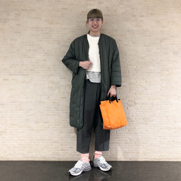 今回は落ち着いたアイテムを合わせましたが、無地でスッキリした形なので、色や柄をふんだんに使って着たい一枚です!!!