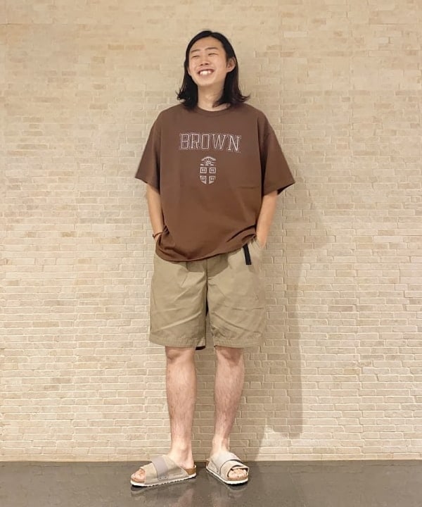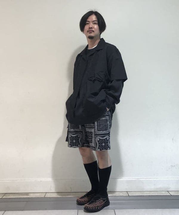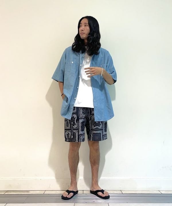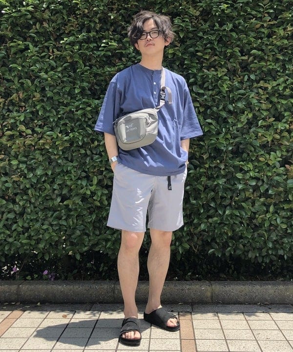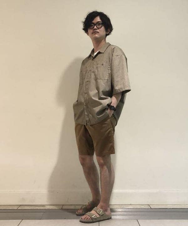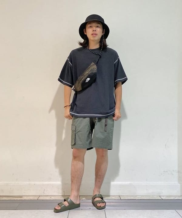 オンブレチェックにヴィンテージ感が漂うTシャツを忍ばせて『THE アメカジ』と言った合わせですね。ショーツのカラーリングがビビッとな感じなところをシャツとサンダルのBLACKで全体的に引き締める。