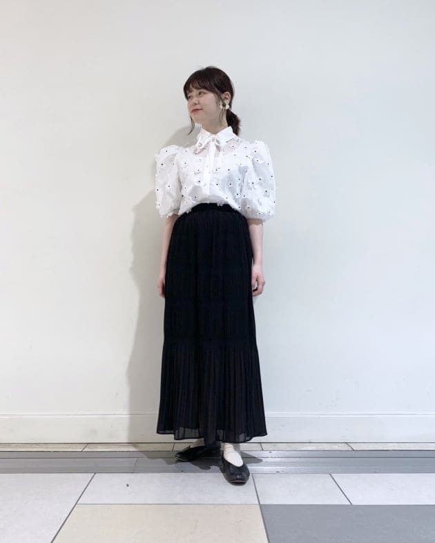 ペイント風のお花がプリントされたトップスと、ボリューム感あるティアードスカート!