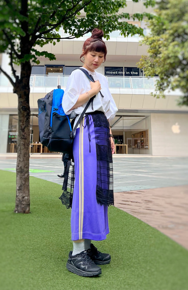 今回は裾部分のドローコードをぎゅーっと絞って履いてみました!