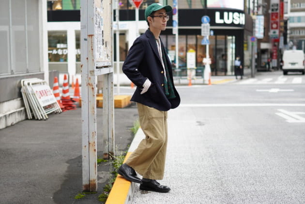 ボタンダウンシャツやミリタリートラウザーズ等で王道と言える組み合わせではありますが、