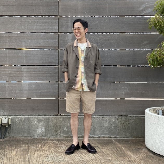 ココナッツ帽子やロングボードを楽しむ人達をモチーフにした柄はデザイナーのアーカイブの中からサンプリングし選んだ、